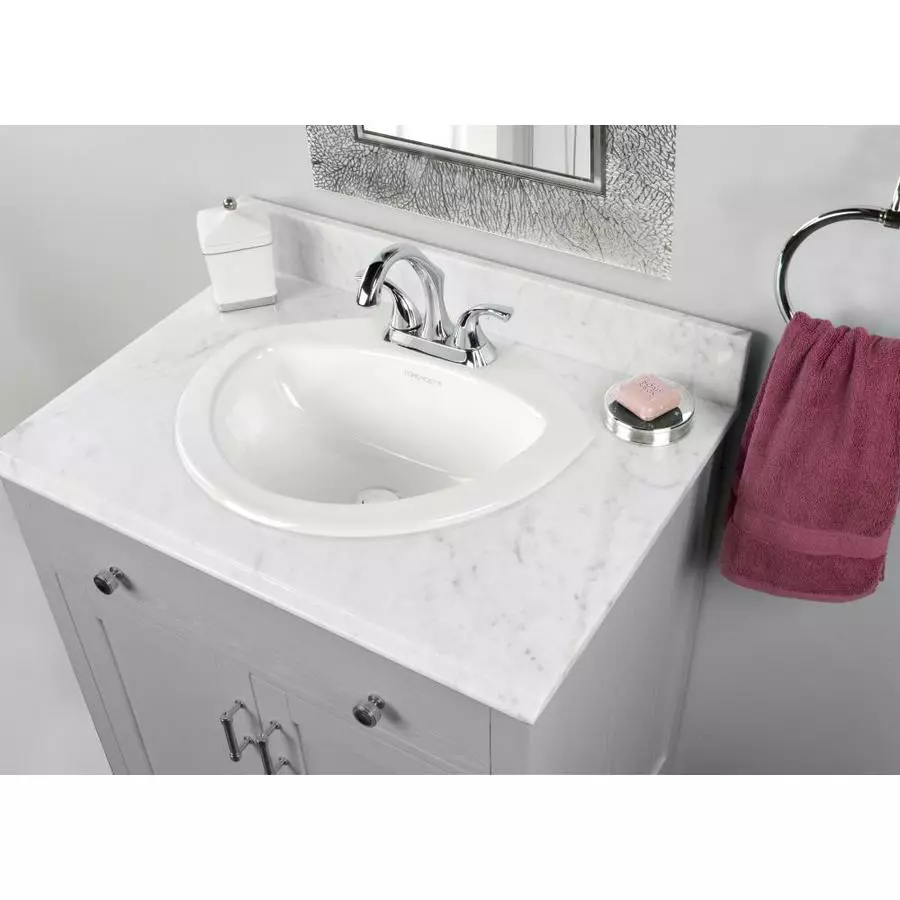 The Ladelle drop-in oval bathroom sink model from Project Source features a grade A vitreous porcelain design, 3 holes and front overflow. With a 4-in center distance, it gives an aesthetic dimension to a small bathroom counter.