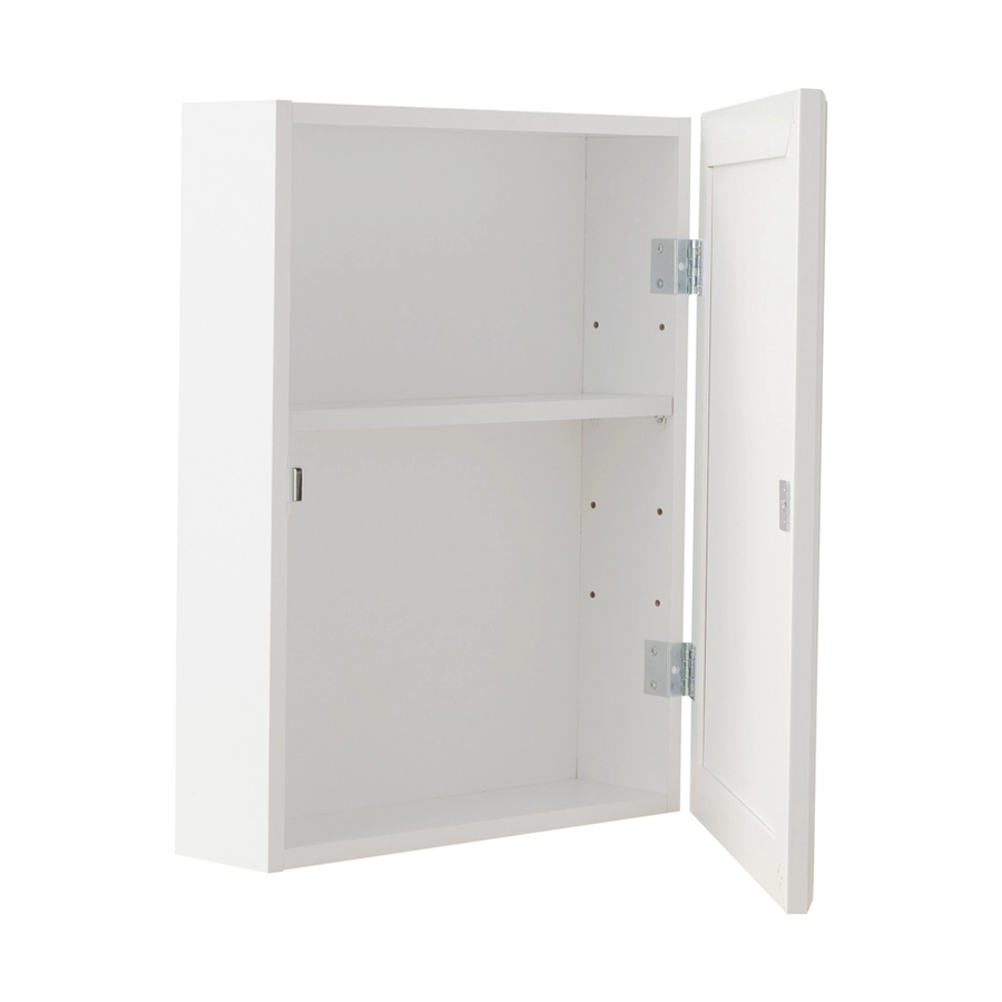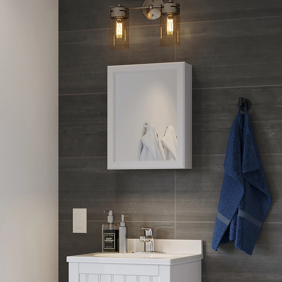 - White finish surface mount medicine cabinet is ideal for smaller bathrooms